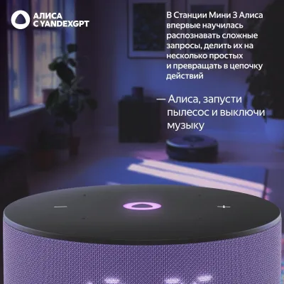 Станция Мини 3 – это не только стильная колонка, но и центр управления вашим умным домом. Через приложение «Дом с Алисой» можно подключить осветительные приборы, бытовую технику и системы климат-контроля. Настраивайте сценарии, которые автоматизируют повседневные задачи. Например, одной командой вы можете выключить основной свет и включить уютную подсветку, создавая комфортную атмосферу в доме.Яндекс Станция Мини 3 – это компактное, но мощное устройство, которое сочетает стиль, функциональность и передовые технологии, делая вашу жизнь удобнее и ярче.