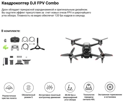 | Комплектация | Дрон DJI FPV; Интеллектуальная полетная батарея; Пропеллеры (пара) - 4 шт.; Защита подвеса; Верхняя крышка; Пульт управления 2 - 1 шт.; Запасные джойстики (пара); Очки Goggles V2; Антенна для очков (Dual Band) - 4 шт.; Аккумулятор для очков; Кабель питания для очков (USB-C); Крепление на голову для очков; Подкладка для очков; Адаптер питания переменного тока; Кабель питания переменного тока; Кабель для передачи данных (USB-C); Кабель OTG (USB-C). |