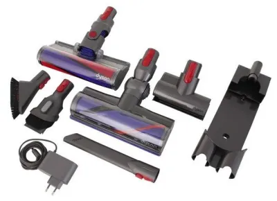 В комплекте: универсальная насадка с прямым приводом 35 Вт, насадка с мягким валиком, мини-электрощётка для мягкой мебели и уборки шерсти домашних животных, щётка с мягкой щетиной, комбинированная насадка, щелевая насадка, док-станция, которая служит не только для подзарядки, но и обеспечивает удобство хранения пылесоса и съёмных насадок.