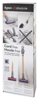 Вертикальный беспроводной пылесос Dyson V8 Absolute оснащён никель-кобальтовым алюминиевым аккумулятором, обеспечивающим до 40 минут работы без потери мощности всасывания.