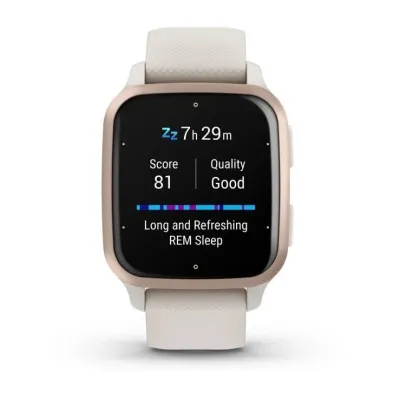 Смарт-часы Garmin Venu SQ 2 Music Edition - 40 mm, цвет Слоновой кости с персиково-золотым алюминиевым безелем, бежевый ремешок
