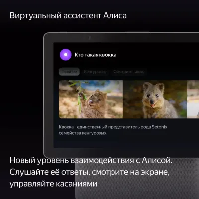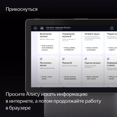 Сенсорный экран большого размера можно поворачивать горизонтально или вертикально, что делает его универсальным для любых задач. Просите Алису искать музыку, фильмы или сериалы, а затем управляйте всем этим прямо на экране: ставьте на паузу, перематывайте или выбирайте нужный эпизод. Смотрите телеканалы, задавайте вопросы Алисе и получайте визуальные ответы. А если нужно, используйте встроенный браузер для поиска информации, не отвлекаясь на другие устройства.